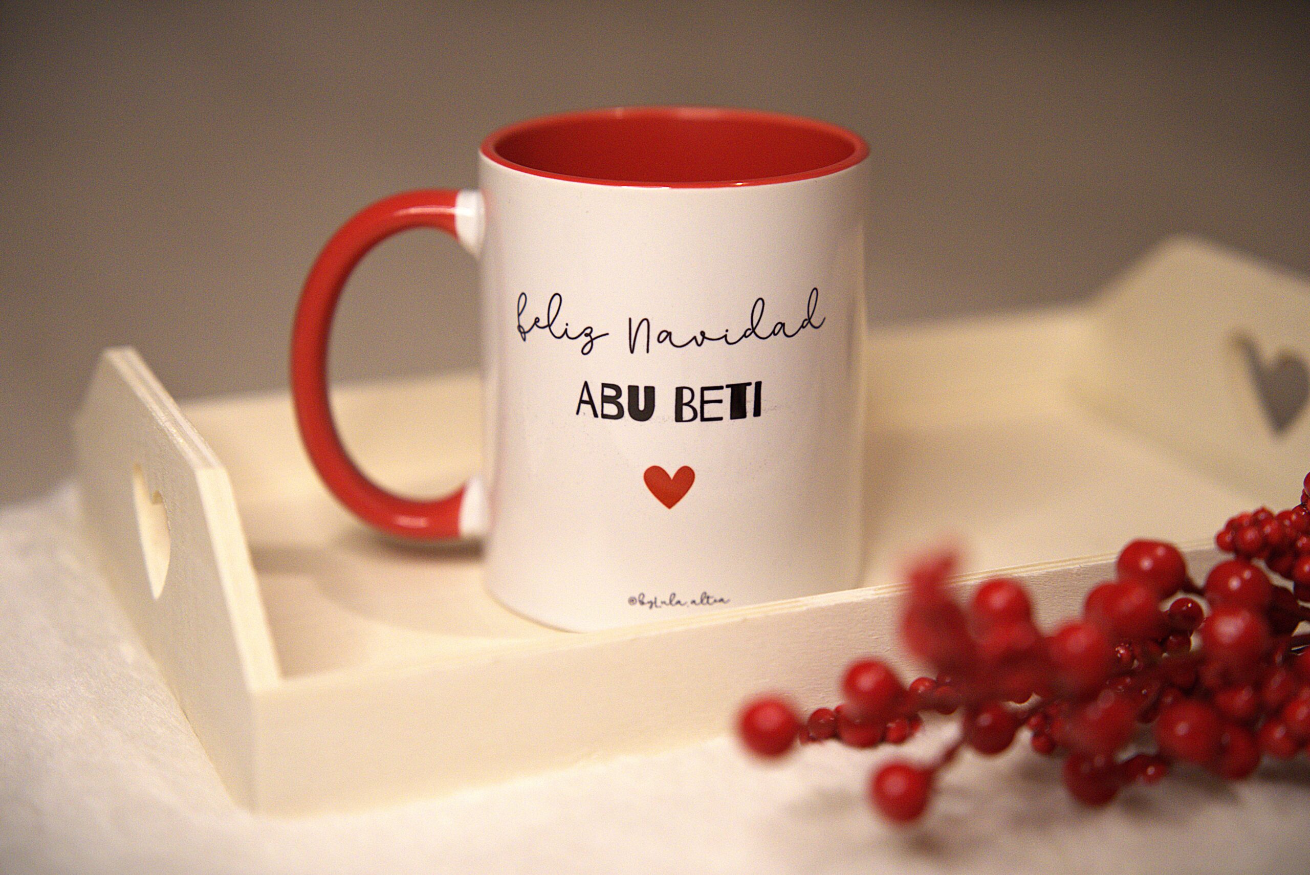 Taza personalizada con asa e interior rojo, perfecta para la época de Navidad.